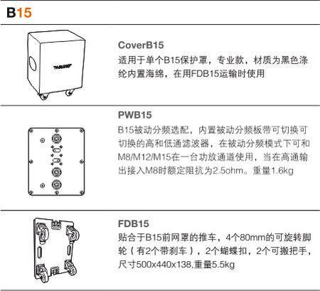 阻抗 4 ohm(在被動模式下與M8搭配,使用高輸出是為2.5 ohm) 覆蓋角度 (水平×垂直) 全向 靈敏度 1W/1m 94dB 最大聲壓/1 m 127dB 接口 NL4 2±(外置分頻) 尺寸 (高×寬×深) 506×440×560mm 重量 22.1Kg/24.2Kg(帶分頻板) 涂層 Warnex 結構漆 可選配件 FDB15,Cover B15 可選項 PWB15內置分頻板,主動/被動模式可選