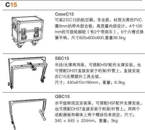 C12和C15也裝配了久經考驗的飛行軌,用飛行扣配件和專門為它開發的旋轉支架,就可以將C系列音箱輕易支撐起來。支架的設計令你徒手即可操作,無需工具,也不容易遺失零件。不管是作為監聽音箱還是前場補聲音箱,C系列都是毋庸置疑的高性能多功能監聽音箱。